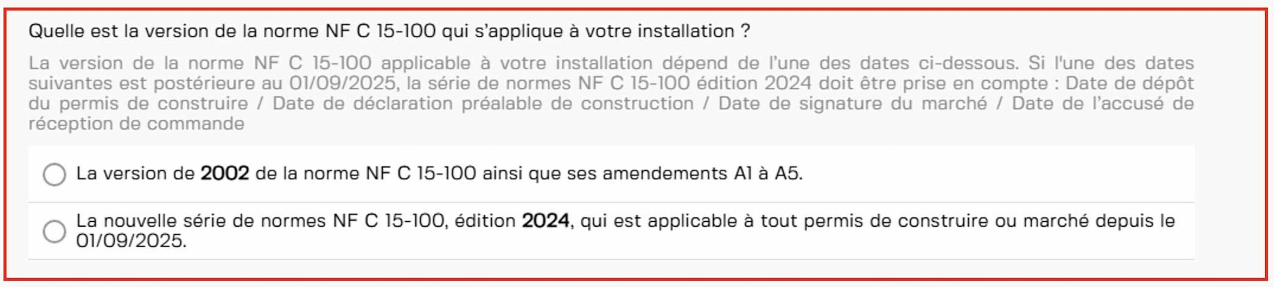 «Quelle est la version de la norme NF C 15-100 qui s’applique à votre installation ?»