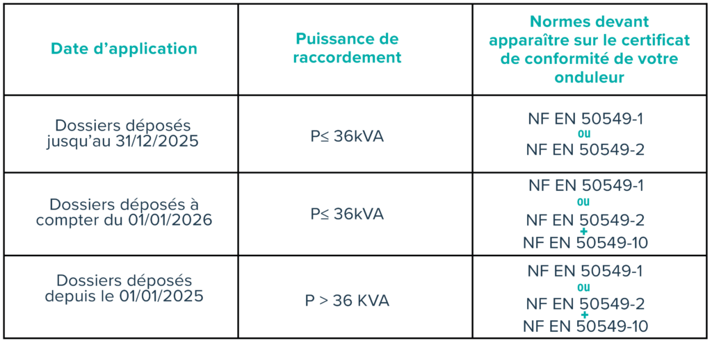 La période transitoire de 24 mois, annoncée dans nos 2 articles publiés en 2024 durant laquelle les différents types de certificats de découplage ont cohabité, arrive à son terme dans quelques semaines. Cette phase a eu pour objectif de permettre aux fabricants d’onduleurs d’adapter leurs équipements et leurs procédures de certification à la norme de tests NF EN 50549-10.